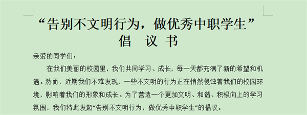 學工部於(yu) 11月初向全校發放“告別不文明行為(wei) ,做優(you) 秀中職學生”倡 議書(shu) ,倡議全體(ti) 同學: